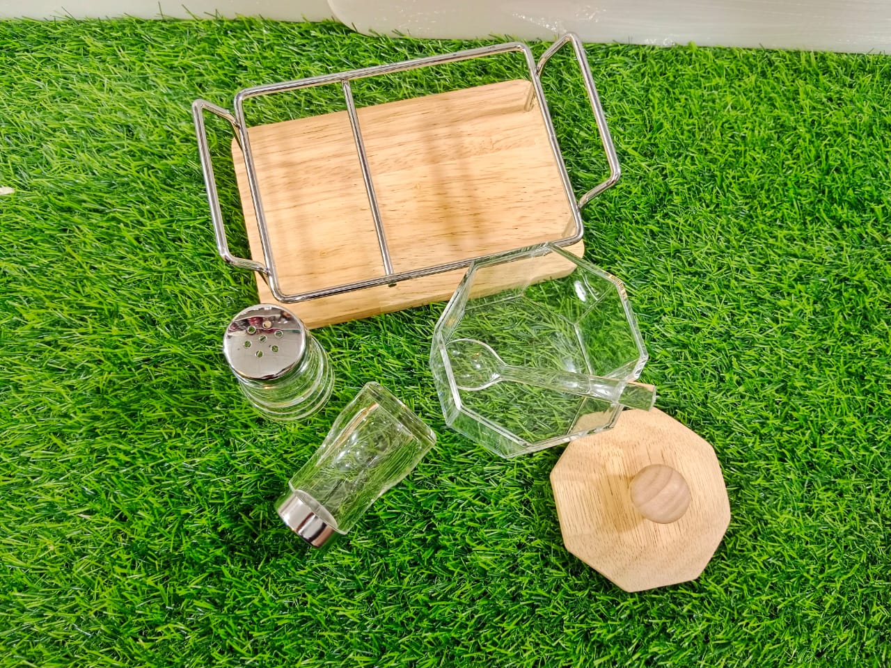 3 pc Cruet Set with Stainless Steel Stand | Tabletop Sugar pot and shakers